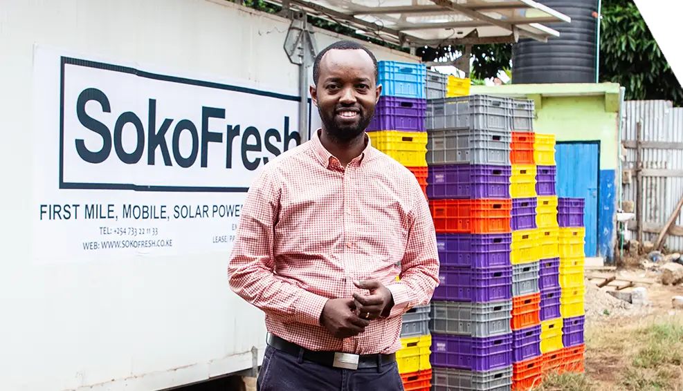 The CEO of SokoFresh stands in front of one of their ground breaking solar powered mobile cooling systems.
