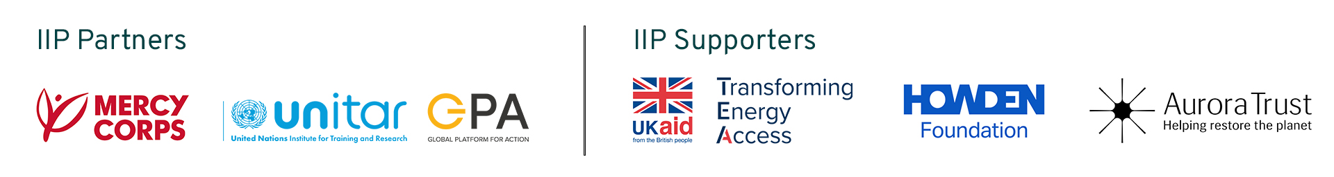 IIP partner logos - Mercy Corp, United Nations Institute for Training and Research, Global Platform for Action. IIP Suppoters logos - Transforming Energy Access, Howden Foundatiuon, Aurora Trust